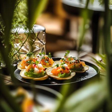 Traditional Mexican tacos on a plate in a restaurant. Macroshoot, minimalistic concept. Mexican tapas. shot through a plant in the foreground. Selective focus.