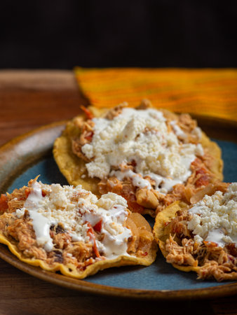 Tostadas with chicken tinga, cheese and cream on a plate on a wooden table. Typical Mexican food.