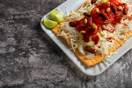 Flour chicharron prepared with sauce, vegetables and pickled pork skin. Mexican fast food.