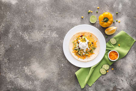 Plate with tasty taco and sauce on grunge background