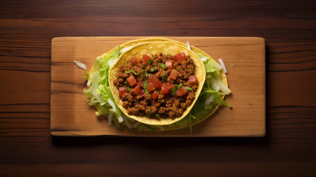 a mexican taco, captured in stunning 32k uhd resolution, is showcased on a wooden board. the photograph, taken with a tokina at-x 11-16mm f/2.8 pro dx ii lens, features a matte finish that enhances the smooth and curved lines of the taco. the image captures the organic movement of the dish. ai generated