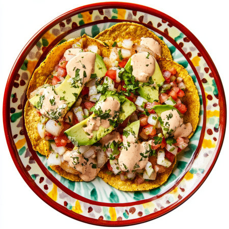 A plate of fish ceviche tostadas, crispy tostadas topped with fish ceviche, avocado, and pico de gallo, drizzled with a creamy chipotle sauce, arranged on a colorful plate, isolated on clean white