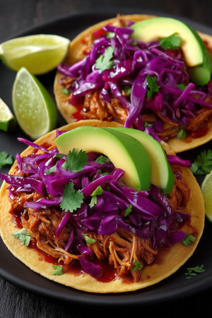 Vegan jackfruit tacos served with vibrant purple cabbage slaw and creamy avocado. Clean black plate setting with fresh lime on the side.