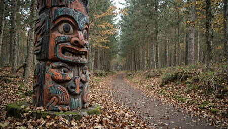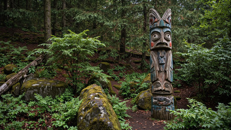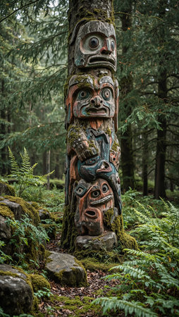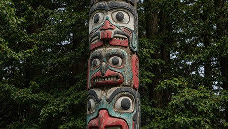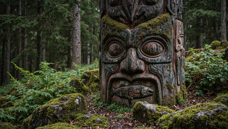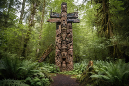 vibrant totem pole standing tall in a north american pine forest, created with generative ai