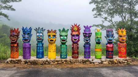 This captivating image features a series of colorful carved totem poles standing proudly amidst a misty landscape, showcasing unique artistry and cultural heritage.