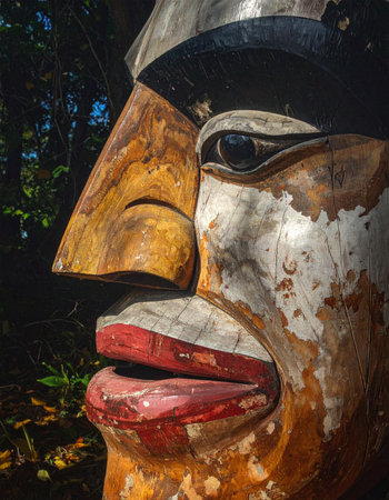 A close-up profile of a weathered wooden totem pole, its painted face telling ancient stories through dappled forest light.
