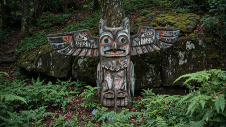 Mystical totem pole with animal carvings in lush forest