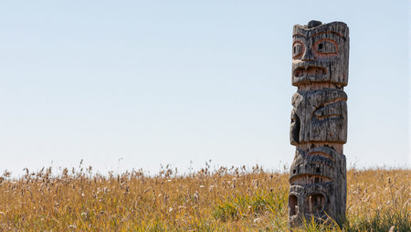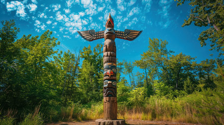 A stunning totem pole rises proudly in a vibrant wilderness, surrounded by lush greenery under a clear blue sky, reflecting cultural artistry and history.