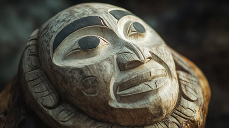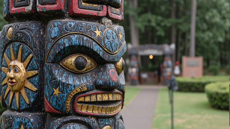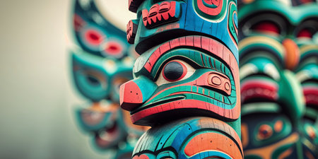 A close-up of a totem pole in a Pacific Northwest tribal village. No people, copy space.