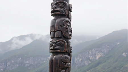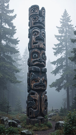 Ancient cedar totem pole with animal figures in misty forest clearing