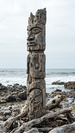Rugged driftwood totem on rocky coast softened carvings from sea exposure