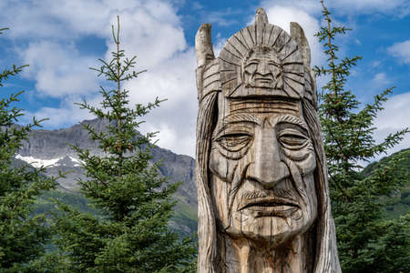 AUGUST 9 2018 - VALDEZ, AK: Trail of the Whispering Giants totem pole statue in Valdez Alaska, by artist Peter Wolf. These are found in all 50 US States