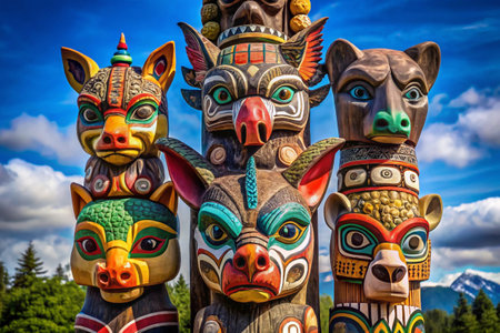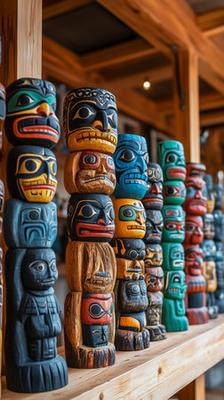 Intricate totem poles stand tall in a museum showcasing indigenous artistry. Each pole is uniquely designed, reflecting cultural significance and craftsmanship.