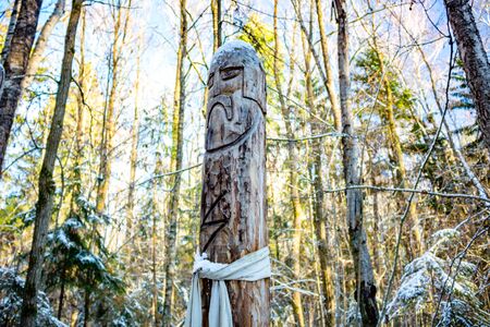 Kaluga region, Russia - November 2017: Slavic pagan idols on the forest temple. Perun