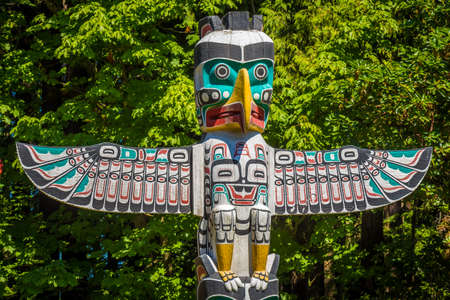 Vancouver, Canada - July 27th 2017: Close up of an eagle themed Totem Pole in Stanley Park, Vancouver, British Columbia, Canada