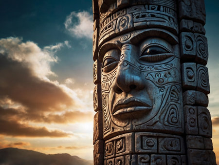 A beautifully crafted wooden sculpture that showcases intricate details of an ancient culture, illuminated by sunlight, creating a stunning visual experience.