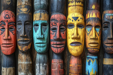 Intricately carved wooden tribal masks with cultural patterns and symbols. That the image is generated using AI.