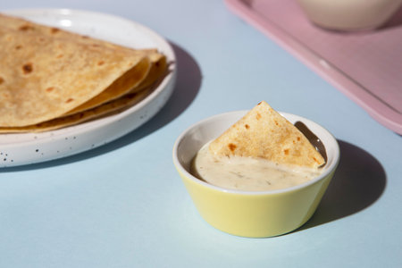 Chicken tinga quesadilla with flour tortilla. Traditional mexican food