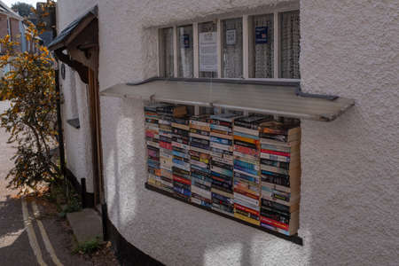 Lympstone, Devon, UK, April, 8, 2019: A pile of various books for sale on a window sill in a village in Devon, all money raised goes to fund the local lifeboat