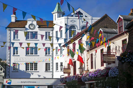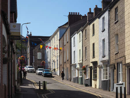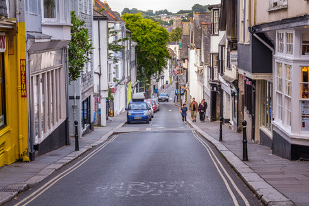Totnes, Devon, England, 21 July 2017: View of the central street of Totnes. Street under a big bias. UK
