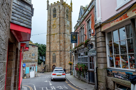 St. Ives.Cornwall. UK- 10.01.2023. A street view of the St. Ia's Parish Church by The Golden Lion pub.