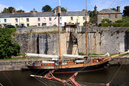Charlestown, Cornwall / UK - July 07, 2020: View of the historical Port with old sailing ships used as props in film production