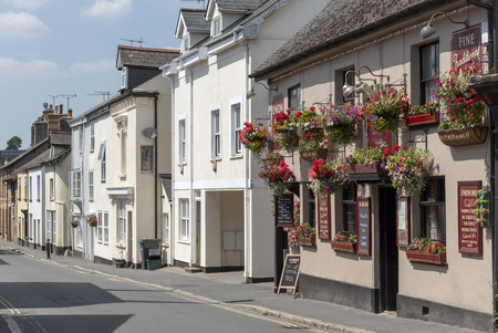 Moretonhampstead small town in the Dartmoor National Park, Devon, England, UK. Town centre pub The Union Inn, with hanging baskets