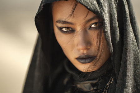 Mysterious person with intense makeup and dark lipstick, wearing a black headscarf. Wind gently lifts strands of hair across a piercing gaze, creating a dramatic, enigmatic atmosphere