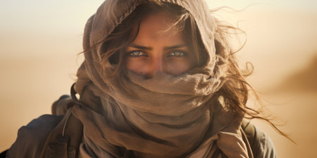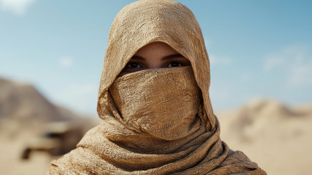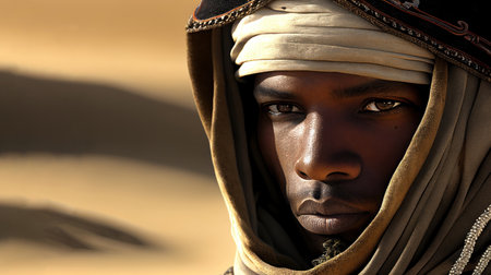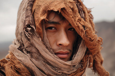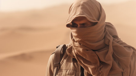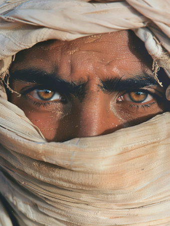 The man, his face partially obscured by a scarf, gazes intently, showcasing his strong features and expressive eyes against a warm desert backdrop.