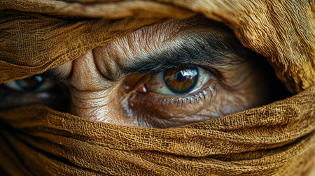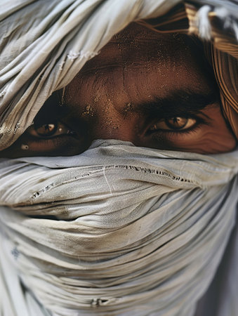 A striking, intimate close-up portrait of a man whose face is partially covered by traditional desert headwear. The focus is on his intense, wise eyes, conveying a sense of resilience and deep character.