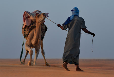 Mysterious Desert Man with Camel at Sunset in Traditional Attire.