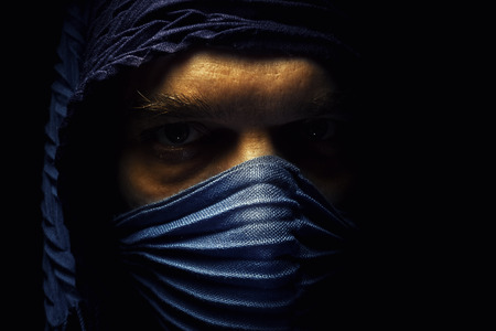 striking dramatic portrait of man in black hood with intense gaze, face partly covered by scarf