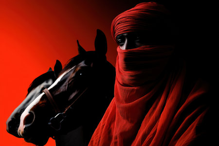 A figure in red fabric stands beside two horses, forming a striking silhouette.