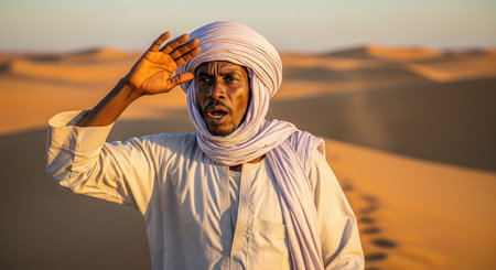 Portrait of a man in a turban looking into the distance in the desert at golden hour. He is a nomad shielding his eyes from the sun.
