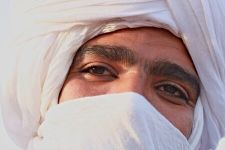 Berber man wearing traditional tuareg clothes in the Sahara Desert at dawn, Merzouga, Morocco