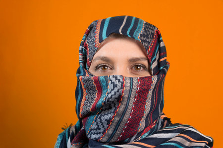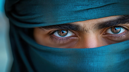 Intense gaze of a person with golden eyes and blue veil. Cultural identity