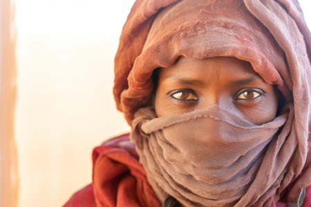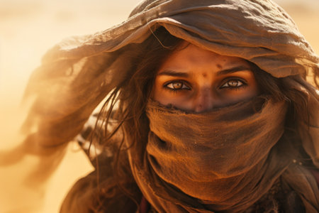 Close up portrait of a beautiful tuareg woman with intense green eyes. A powerful and mysterious gaze of a desert nomad in a blue turban.