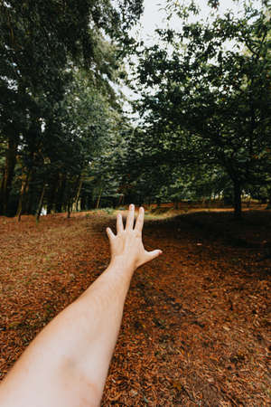 An inspiring wide angle shot of a hand in the middle of the forest during an autumnal day with a lot of fallen leaves and green trees