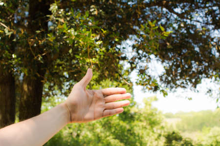 Woods sunrise. Forest recreation. Hope faith. Man hand reaching out to bokeh light beam in blur plants greenery leaves lens flare on outdoors background.
