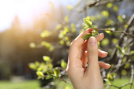 Woman touching tree branch with delicate fresh leaves outdoors on sunny day, closeup