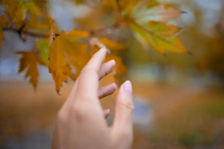 Autumn bright colors in nature. Fall colorful background. Female hand holding red leaves on branches.