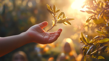Child's Hand Reaching for Olive Branch in Sunlit Garden Concept of Nature Connection, Innocent Curiosity, Peaceful Serenity.