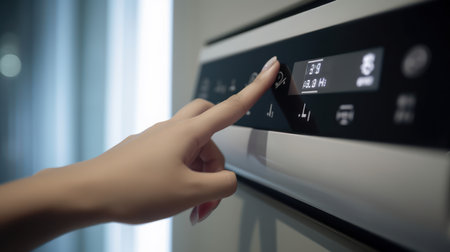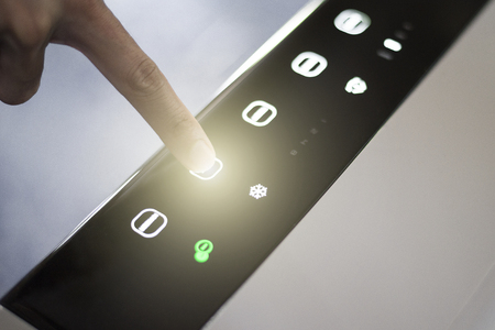 Air conditioning technology, Finger pressing the cooling button, Close-up.