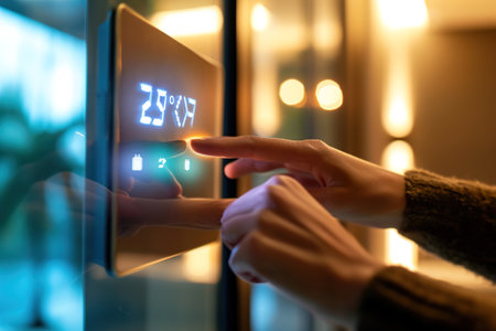 A person's finger touches a digital screen on a wall-mounted smart thermostat, controlling home climate and lighting.
