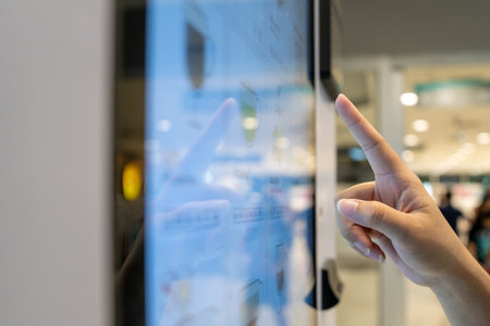A hand interacts with a touchscreen kiosk, displaying information and options in a sleek, modern setting.