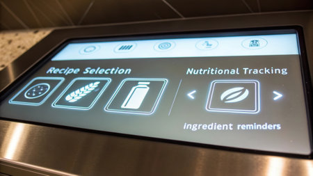 A digital display shows a variety of food options, including broccoli and carrots. The display is on a modern kitchen appliance, which suggests that the image is of a high-tech kitchen or a restaurant