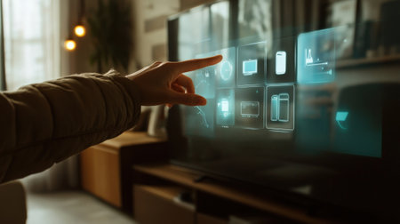 A mediumclose view of a users hand reaching out to interact with a floating holographic display where icons for smart appliances hover midair. The soft glow of the hologram contrast