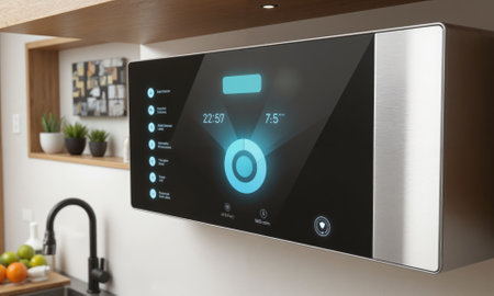 A sleek touchscreen control panel is mounted in a modern kitchen, showcasing the integration of smart technology for effortless home management and automation.