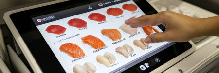 Customer Using Touch Screen Menu for Ordering and Electronic Payment, Restaurant Technology