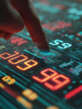 Hand interacts with a digital odds screen displaying vivid data in an augmented reality setting, emphasizing technologies role in real-time information access.